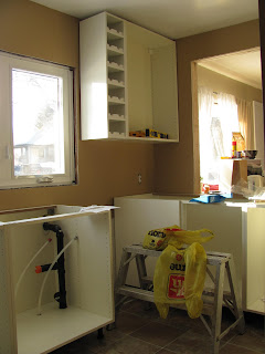 Things are moving along nicely and we now all of the cupboards installed! The pantry isn't in yet, but that'll come last I believe. Next is the countertop which Ben has been kind enough to offer to make for us, but the aborite won't be in until tomorrow or Tuesday. Then the plumbing, and the microwave, and by george, I think we'll hvae a new kitchen! WOOT! (Oh, and the light fixture is new, too)
